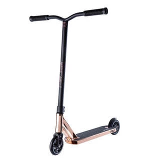 The PRO complete 2-wheel scooter is a great starting point for more advanced skatepark tricks. Presented in bold color options with integrated grips, the PRO features a high quality aluminum fork, a robust double clamp, and an integrated headset – complete with chromoly BMX low-rise handlebars and sleek aluminum wheel cores. The added durability gained through an extruded aluminum alloy deck provides long-lasting, yet lightweight handling. Take your PRO to the skatepark and practice those next level tricks!